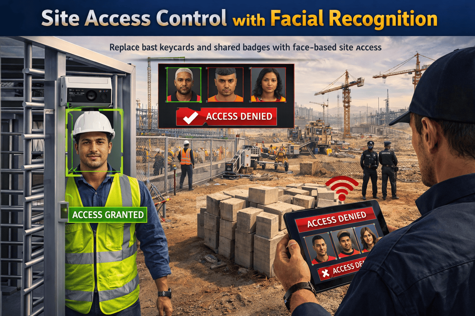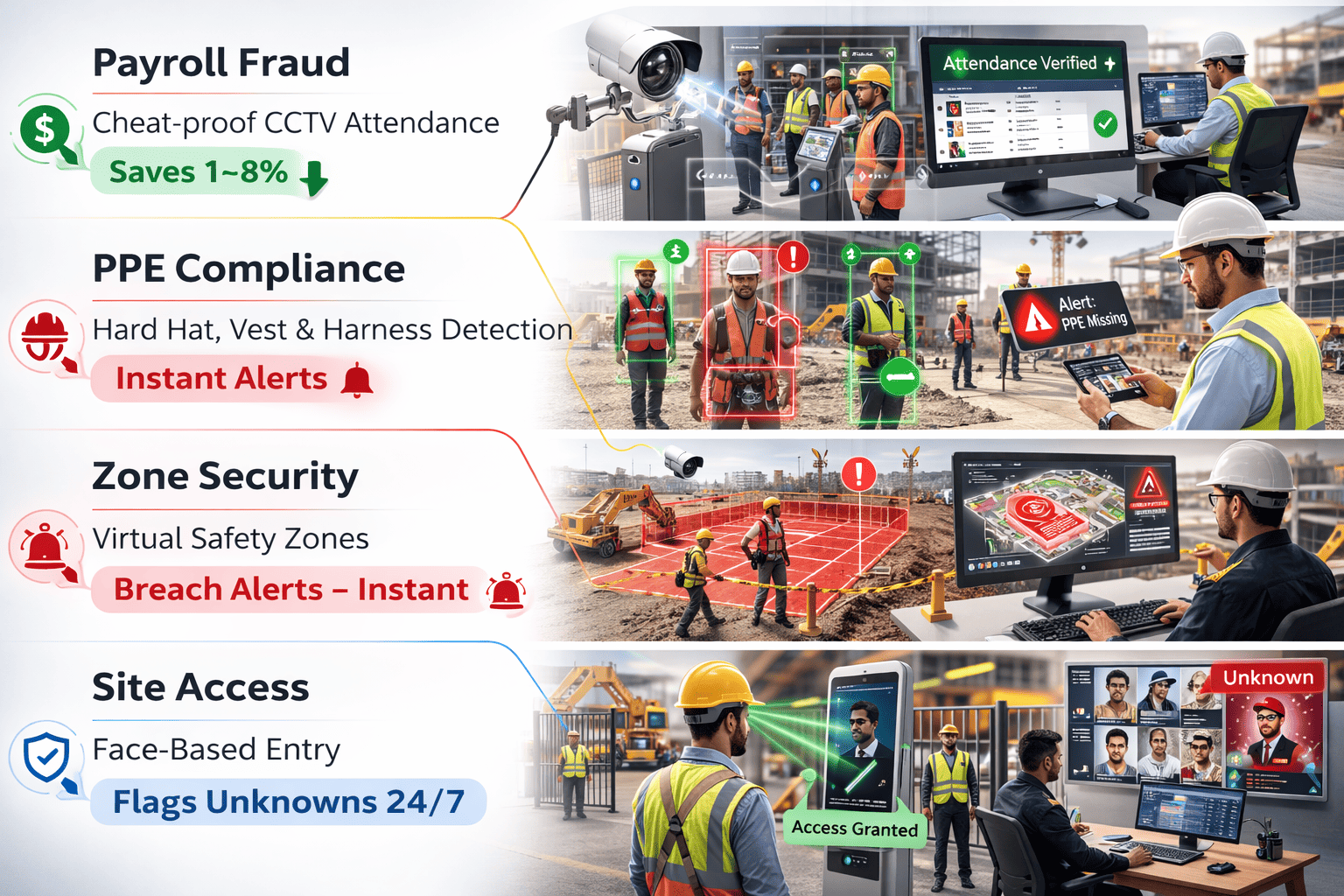 Site Access: Face-based entry. Flags unknowns 24/7. No keycards.
