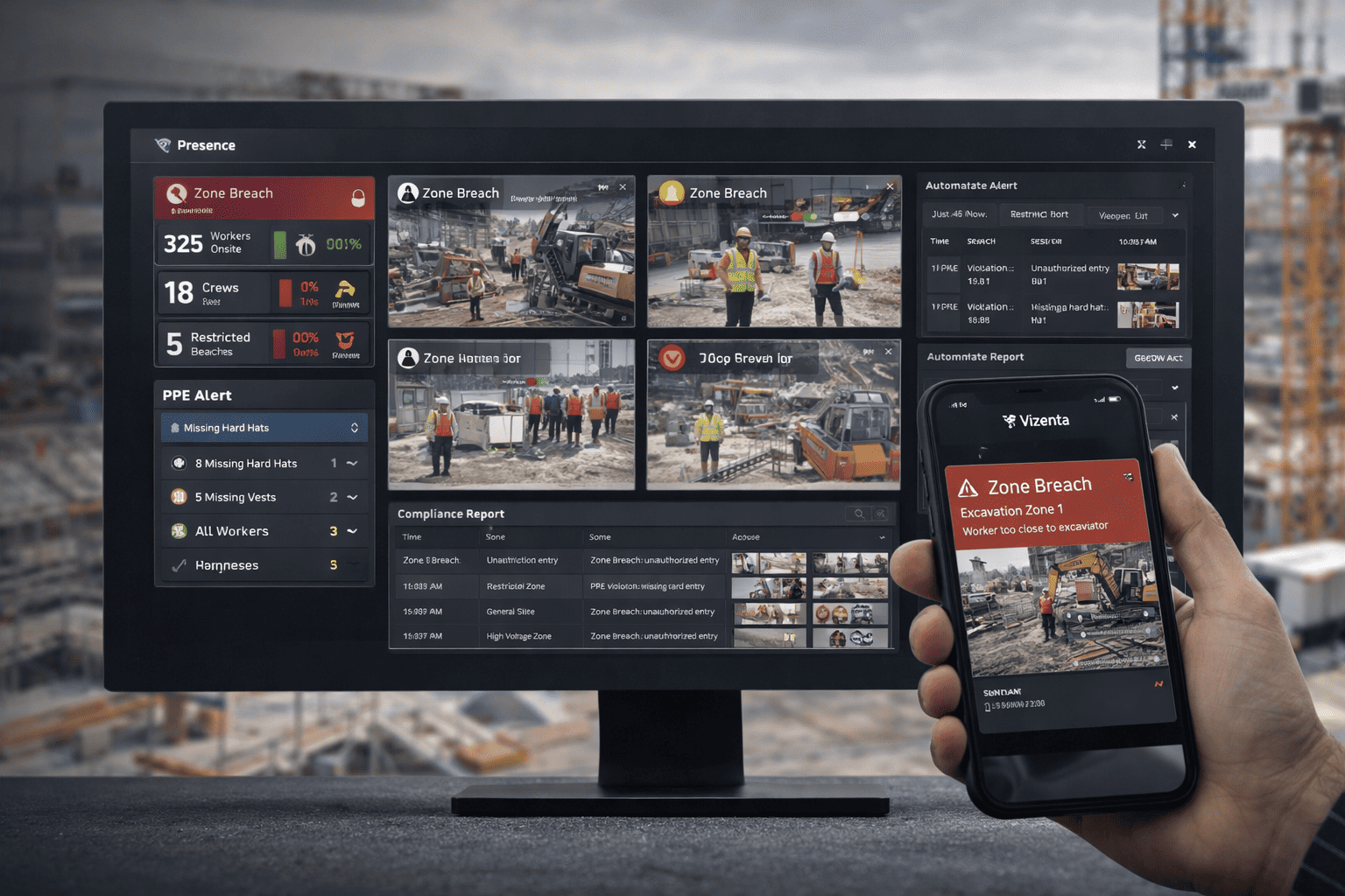 Define entry points, restricted zones, PPE requirements, and shift schedules through the Vizenta dashboard. Set alert rules per zone. Configure region-specific compliance rules — OSHA standards, BOCW requirements, or GCC midday work ban schedules.