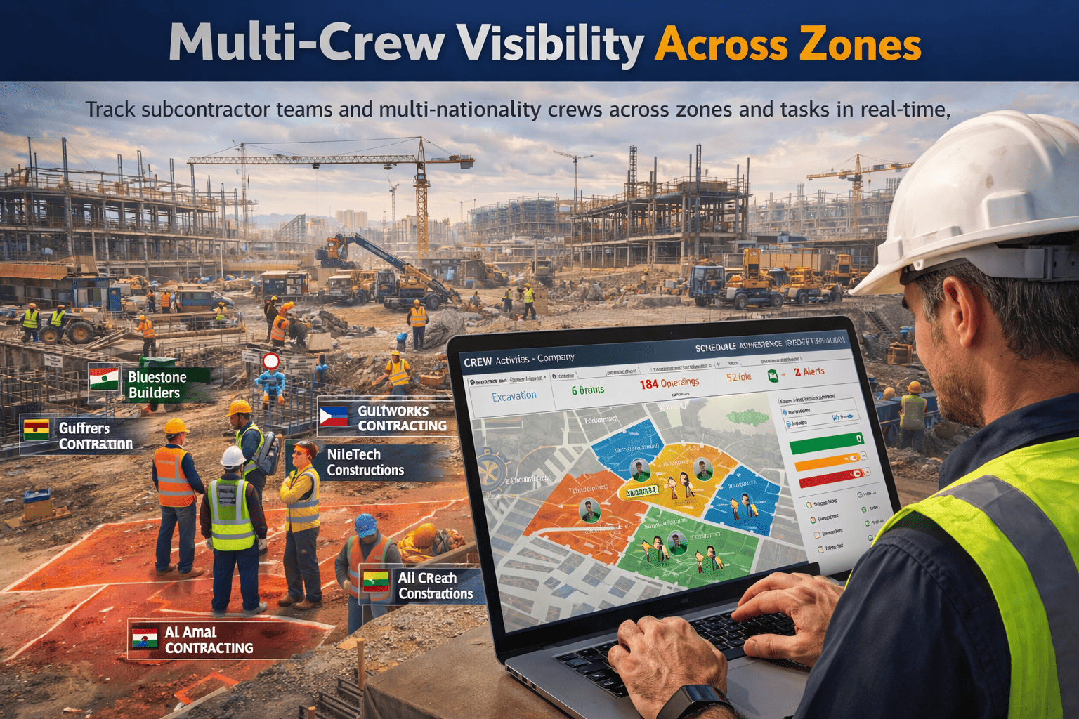 Track subcontractor teams across zones and tasks in real time. Know exactly which crews are on site, where they're working, and whether they're following schedule. Centralized dashboard — no field visits required.